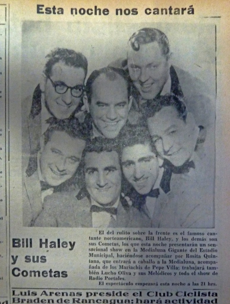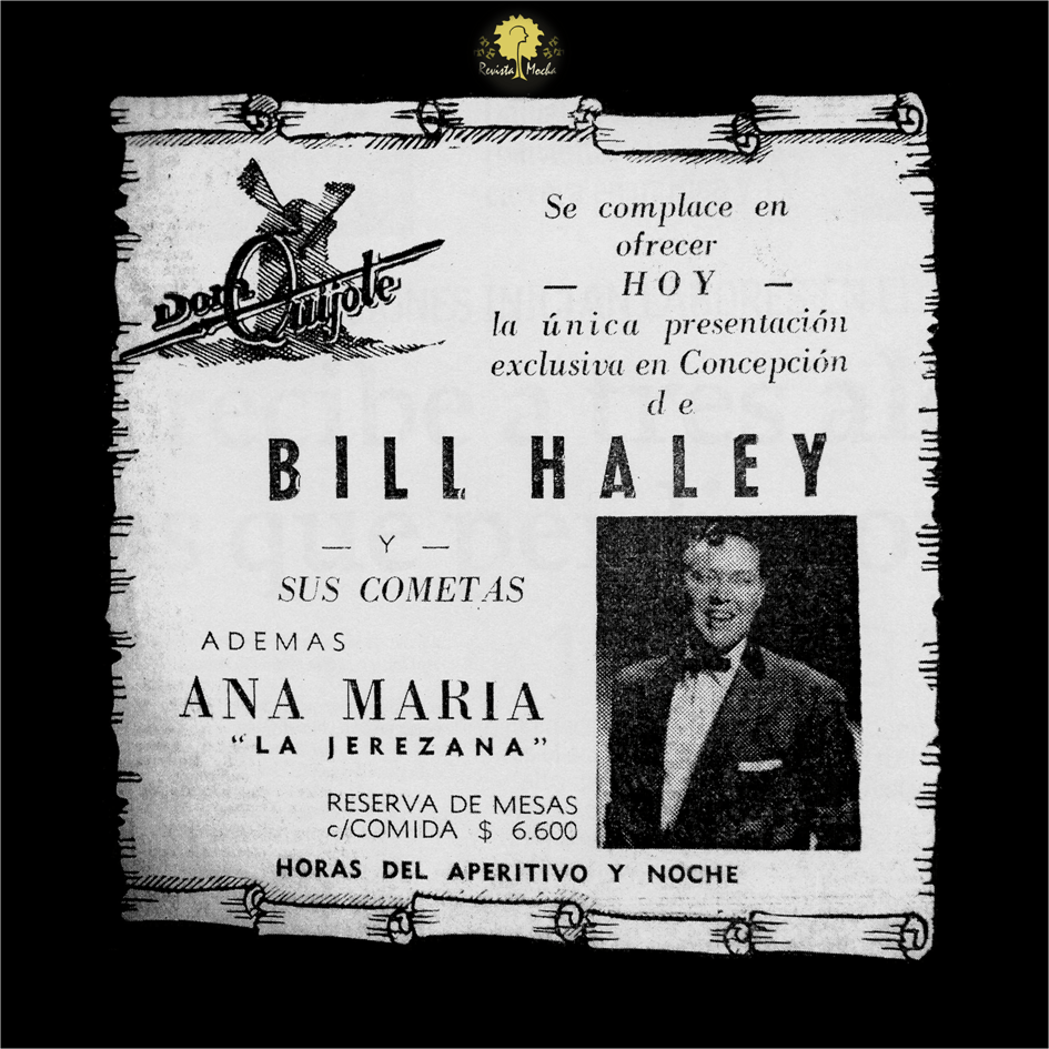 Bill Haley (1925-1981) fue otro de aquellos legendarios músicos que estuvieron en Chile y que hoy pocos recuerdan. Haley es considerado uno de los fundadores del sonido más clásico del rock and roll; vendió más de veinticinco millones de discos en todo el mundo; es miembro del Salón de la Fama del Rock and Roll; tocó para la reina Isabel II en el Royal Performance; ha sido versionado por decenas de bandas (desde Elvis Presley hasta los Sex Pistols); hay un asteroide con su nombre; obtuvo éxitos globales que hasta el día de hoy suenan en radios y fiestas, como «Rock Around the Clock», «See You Later, Alligator», «Shake, Rattle and Roll», “Rip it up” y «Razzle Dazzle», y fue el primer artista de rock and roll en presentarse en el show de Ed Sullivan, y en ver cómo las chicas se tiraban encima del auto con tal de tocarlo. Nacía con él el concepto de estrella de rock, pero nadie sabía bien de qué se trataba ni cómo manejarlo.